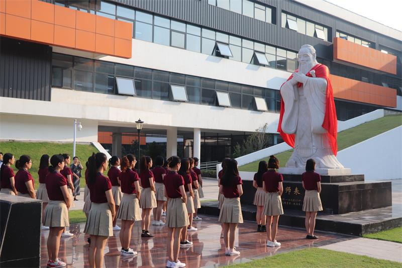 祭孔仪式在悠扬肃穆的古乐声中开始。身着礼仪汉服的学生及众祭者肃立于孔像前。首      先是教师代表向孔子像诵读誓词鞠躬行礼。孔子思想是中国传统文化的主干,承继孔子的教育思想(师齐)—-因材施教、教学相长、有教无类、温故知新、学思并用,以万代师表孔子为楷模,教书育人,做现代教育的践行者、开拓者。让我们怀着崇高的敬意,对我们的先师——孔子,致礼!