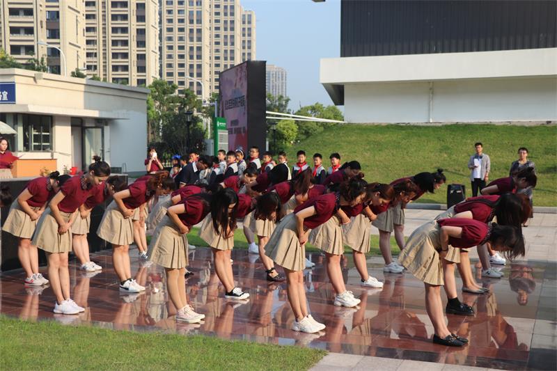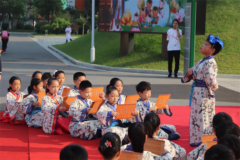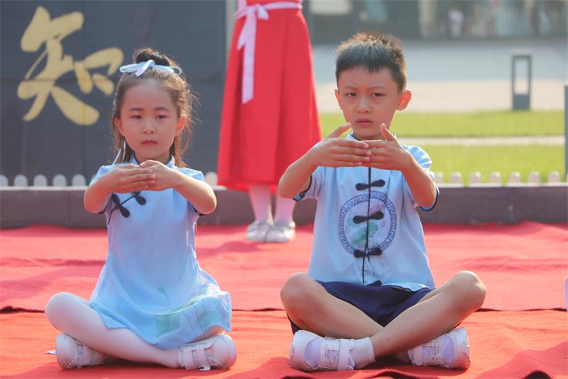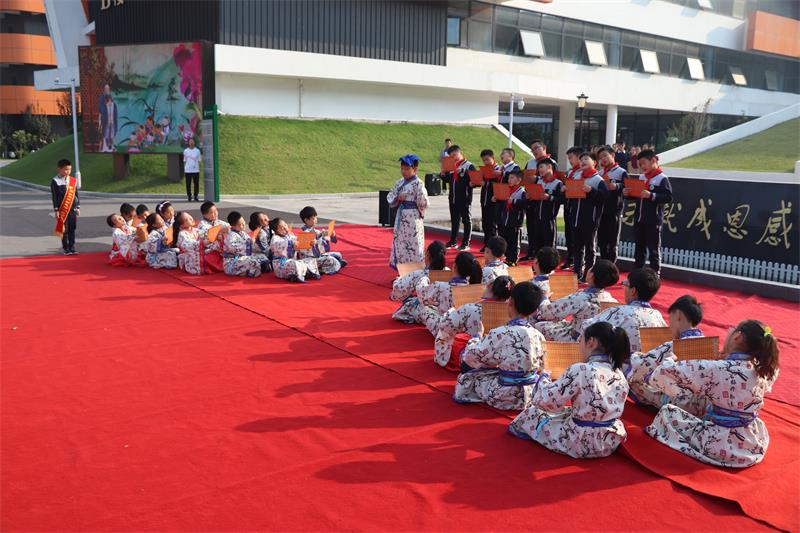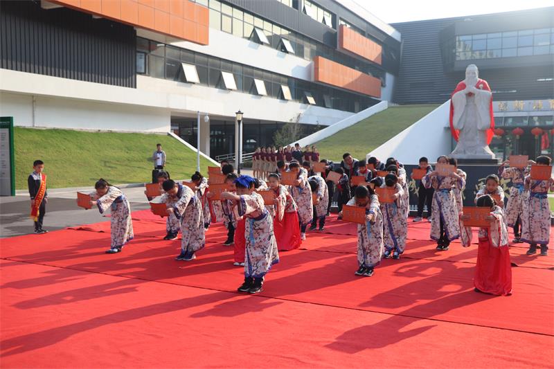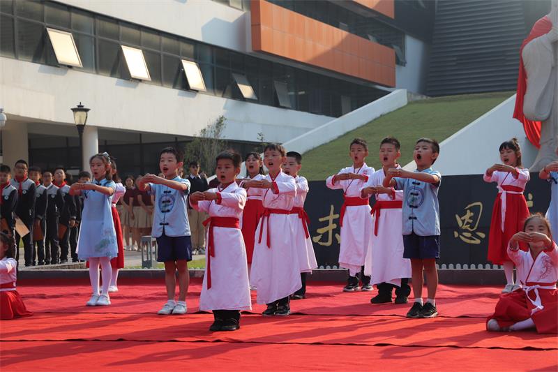 学生整齐站列身着汉服吟诵誓词,向孔子像作揖行礼,诵读誓词。励志成为谦虚谨慎、严格自省、品格高尚的树恩人。而后,学生表演了《君子九思》《孔子爷爷》等节目。