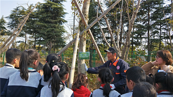 南佛园林武硕州总经理为师生们讲解植树方法,科普小知识